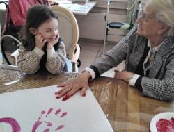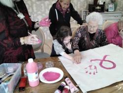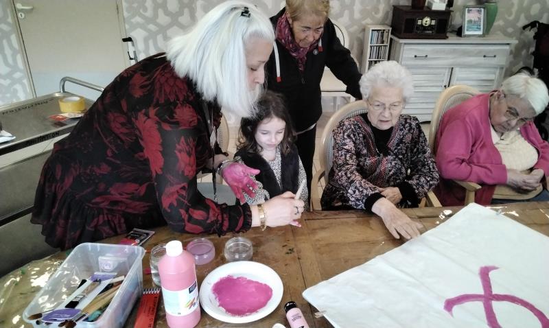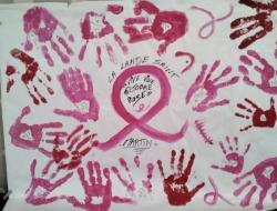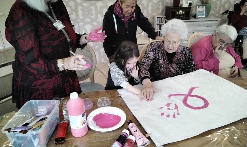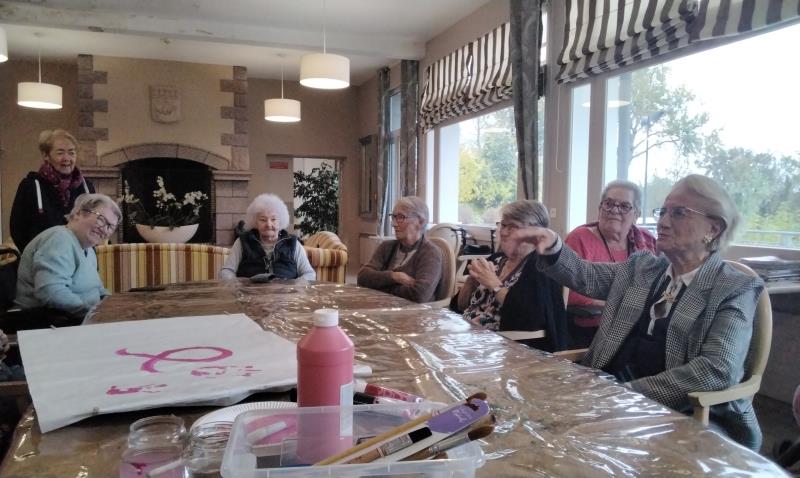 Une façon ludique et créative pour soutenir la campagne annuelle mondiale destinée à sensibiliser les femmes au dépistage du cancer du sein. les résidentes n’ont pas hésité à se mettre les mains dans la peinture sous les yeux amusés de l’arrière petite fille d’une résidente et réaliser ainsi une jolie fresque. Nora, la petite fille a laissé également son empreinte. Un moment de pure Bonheur.