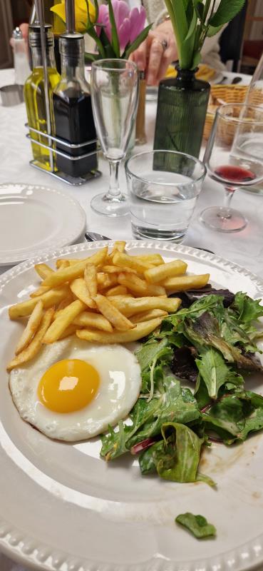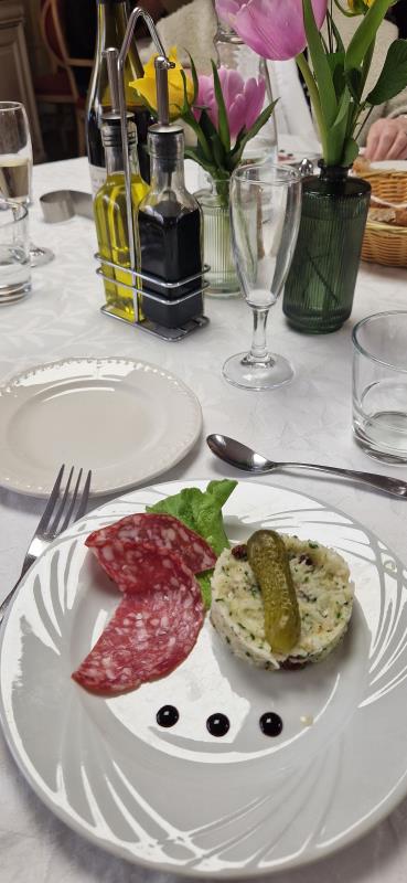 Ce moment convivial a permis de se retrouver autour d’un menu gourmand : salade de chou et rosette en entrée, œufs sur le plat servis avec salade et frites, suivi d’un plateau de fromages. Pour terminer sur une note sucrée, un éclair au chocolat suivi d'une boisson chaude.