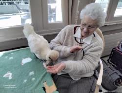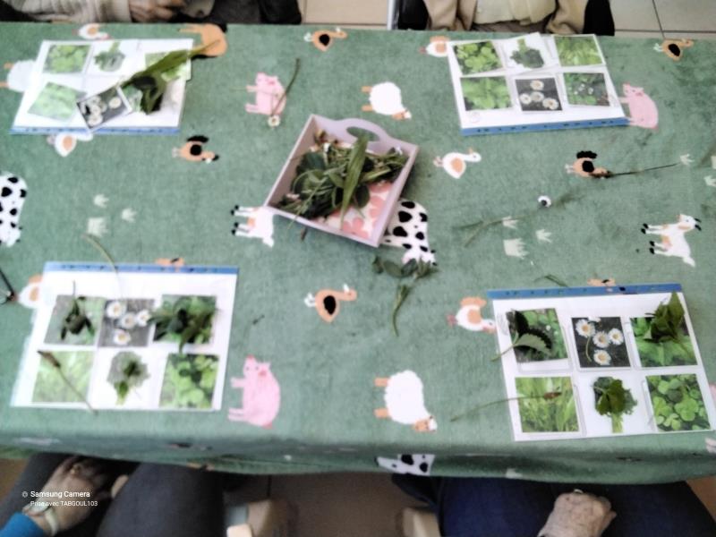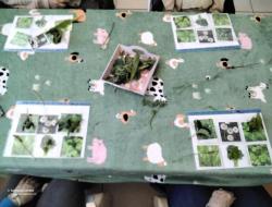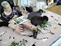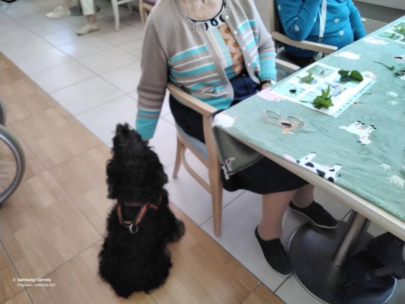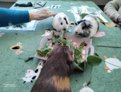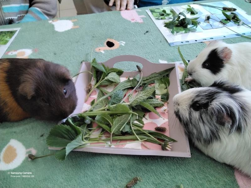 La séance du 23 avril a réuni plusieurs animaux (chien, chat, lapins béliers, poules et cochons d'inde) et a proposé des activités autour des plantes, où les participants devaient associer des végétaux à ceux consommés par les animaux. Dans un tableau les résidents devaient mettre les photos des plantes (menthes, pâquerettes, feuilles de fraisier, trèfle, persil) et ensuite retrouver et les placer sur le tableau. Les objectifs recherchés étant la concentration, la manipulation, l'observation et la communication.