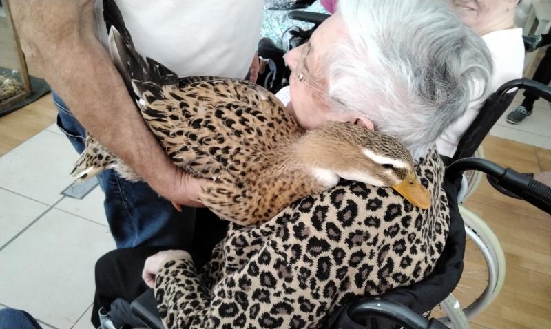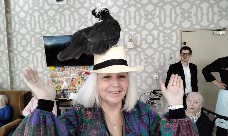 Un moment tendresse avec la cane qui a fait de nombreux câlins à nos aînés. Les petites poules ont pris pour perchoirs les chapeaux sur nos têtes pour prendre la pose pour les photos